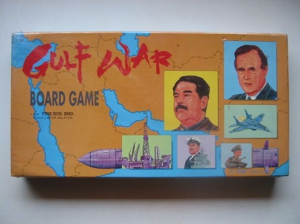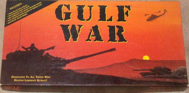 Gulf War is a Malaysian board game from 1990, using as its theme the then ongoing war in the Persian gulf. Its game mechanism is borrowed from An Qi (literally dark chess, because pieces are covered at the start and so unknown to the players: it is a game played using Xiangqi pieces). Each side has a number of pieces ranking from President down to Hostages...