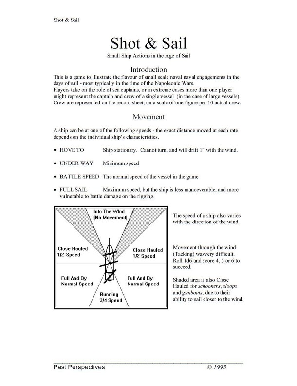 Shot & Sail: Small Ship Actions in the Age of Sail. From the rulebook: "This is a game to illustrate the flavour of small scale naval naval engagements in the days of sail - most typically in the time of the Napoleonic Wars." A miniatures wargame to be played on the tabletop with scale ship models. The players take on the roles of opposing sea captains....