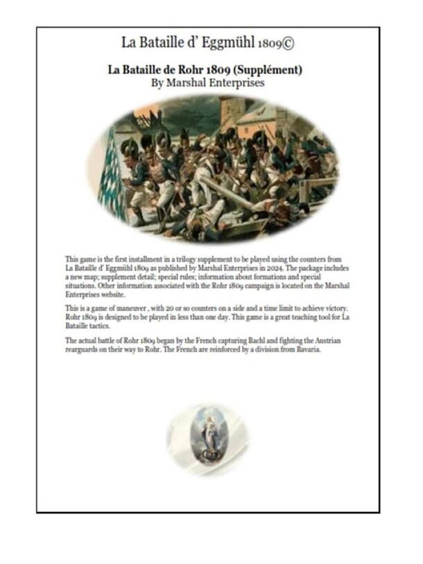 This game is the first installment in a trilogy supplement to be played using the counters from La Bataille d’Eggmühl 1809 as published by Marshal Enterprises in 2024. The package includes a new map; supplement detail; special rules; information about formations and special situations. Other information associated with the Rohr 1809 campaign is located on...