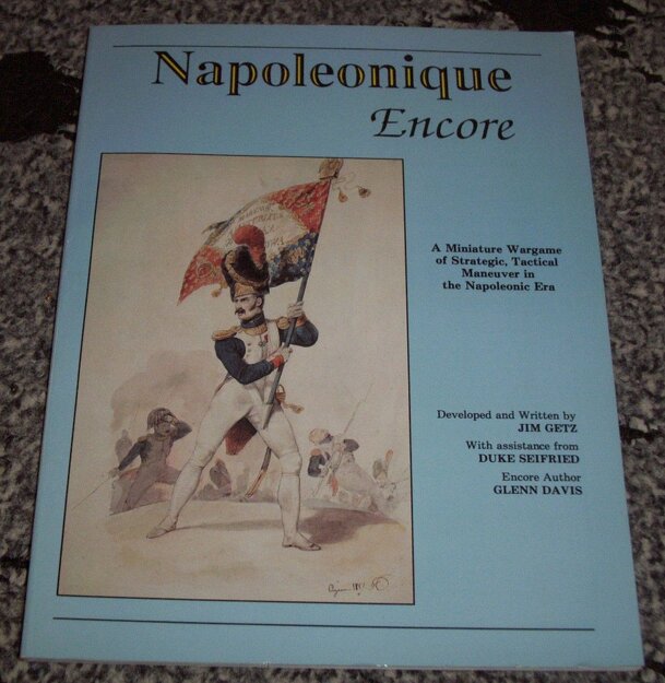 This is a set of rules for Minatures in the Napoleonic era. Originally published in 1971 as Napoleonique, it was revised and reissued in 1992 as Napoleonique Encore. Here is the description from the back of the Encore edition: "Napoleonique /Encore covers the wars of the French Revolution through the many campaigns of Napoleon and to the final battle of...