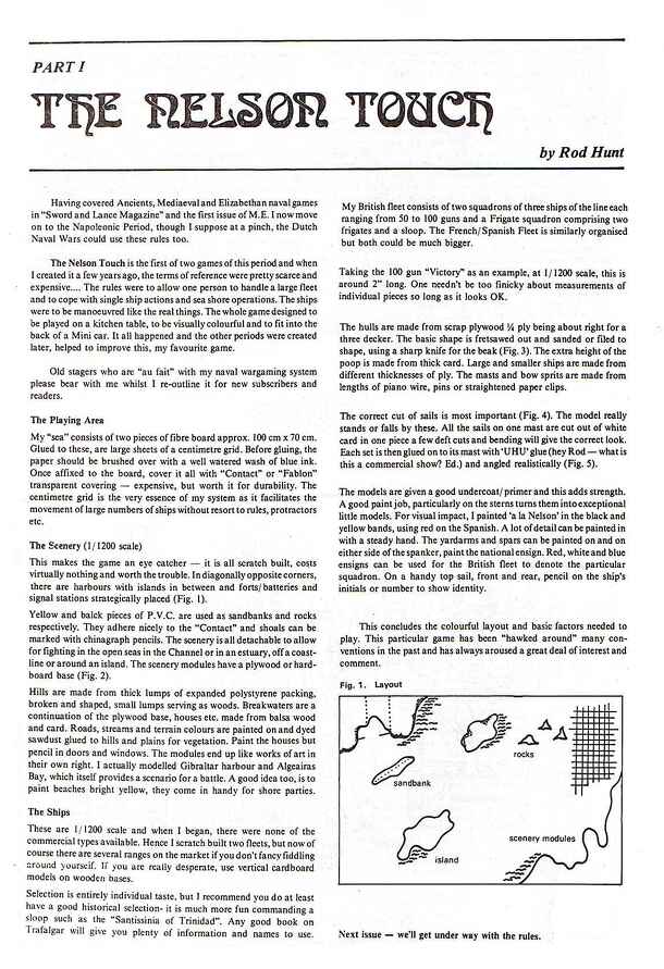 The Nelson Touch is a 1/1200 scale Napoleonic era naval miniature war game published in parts in issues of Military Enthusiast magazine. Part I (from ME #2) covers how to prepare the playing area, what sorts of models to use, and tips on scratch building; Part II (from ME #3) lays out the core rules of the game; and Part III (planned for ME #4) adds...