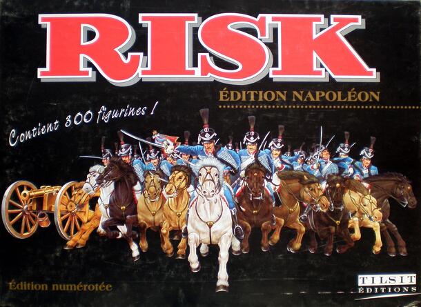 This very special version of Risk was published by Tilsit exclusively in France, as a numbered edition of 10 000 copies. Hasbro's signature is very discreet, appearing in the copyright line as "(c) Hasbro International Inc. Under license of 3D Licensing France". In addition to standard Risk rules, advanced rules introduce fortress sieges, generals...
