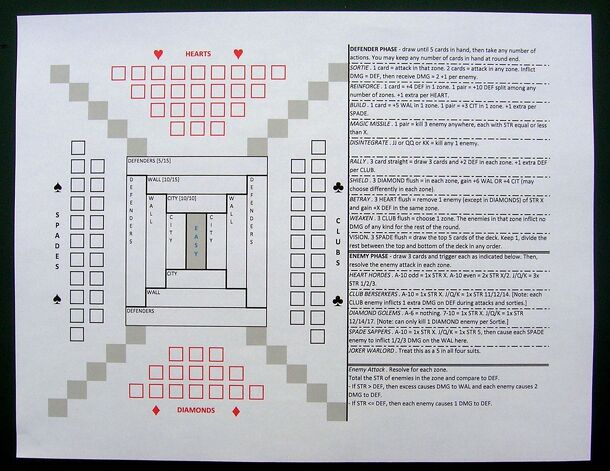 Overview A solitaire print-and-play siege/defense game. Using just a standard deck of playing cards and a record sheet, the player defends a city against a stream of attackers, trying to hold out until the deck is exhausted, at which time a score may be figured based on how well the city survived. Originally created on a business flight because I wish I...