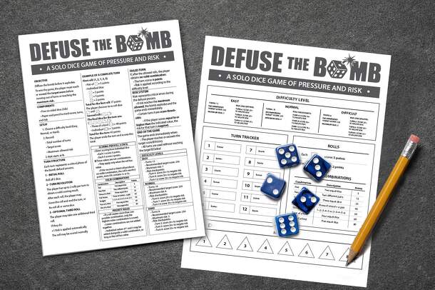 Defuse the Bomb is a solo print & play dice game played with only five six-sided dice. Each turn represents a critical moment in the defusal process. You must decide whether to secure your progress or push your luck, knowing that every additional roll increases the pressure—and one bad decision could end everything. The game focuses on: Meaningful...