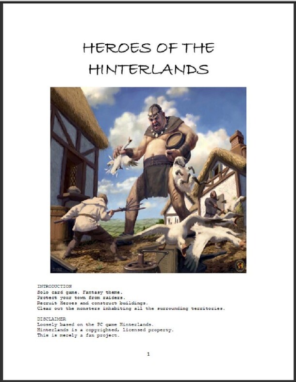 A print and play solo card game loosely based on the PC game Hinterlands. - Protect your town from raiders. - Recruit Heroes and construct buildings. - Clear out the monsters inhabiting all the surrounding territories. You win if you capture all the territories. Your ending Fame score is a measure of how well you’ve done. If your fame ever drops to zero or...