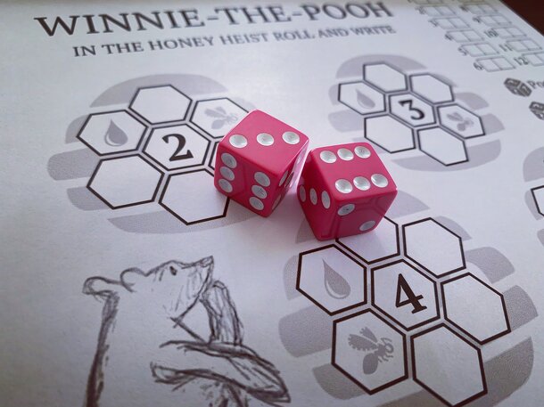 Overview: Help Winnie the Pooh and his friends collect honey from the beehives Players: 1 - 100+ Game Time: 25 minutes Items needed: 2 six-sided dice The game is played over 12 rounds, with players playing simultaneously, trying to earn the most points by placing numbers into runs and sets in each beehive. One die will be used for Winnie the Pooh, while...