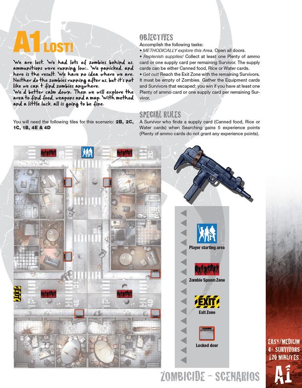 Designed by the original studio, A missions are supplementary missions released online for print and play. A1 is an easy/medium difficulty exploration mission for the original zombicide. Free Mission A1 Lost! We are lost. We had lots of zombies behind us, ammunitions were running low... We panicked, and here is the result. We have no idea where we are....