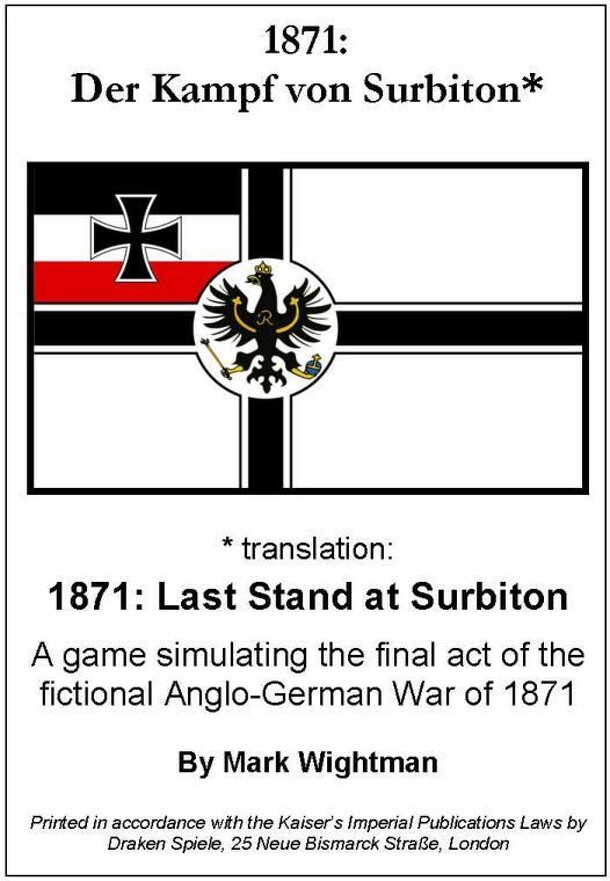 "1871: Last Stand at Surbiton" is a sequel to Draken Games' "1871: The Battle of Dorking". However it is playable as a stand-alone game in its own right. Featuring a 'Dorking Lite' rule set and with a typical game lasting just half an hour or so, the intention is to give a free taster of "Dorking" and the world of the fictional German invasion of England...