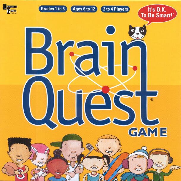 Brain Quest is a roll and move trivia game for players in grades 1 to 6. Players roll a die then are asked a question. Each card has 6 questions on it, one for each grade level. A player may only select a question from a grade equal to the grade he/she has started or higher. If the correct answer is given, the player moves ahead a number of spaces equal to...