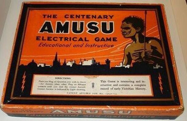 From the box "Educational and Instructive". Trivia game relating to Australia. Point your 'plug' at a question it is your turn to answer. Then place your plug into the answer mode and a light will indicate the correct answer. The player who gets the most correct answers, wind. Probably very hi-tech for 1933. Two versions exist. The Centenary of Victoria...