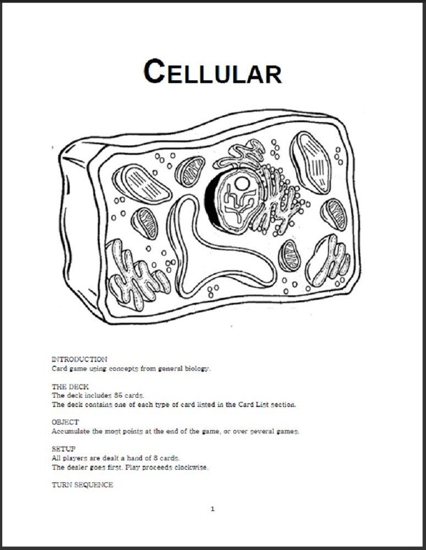“Card game using concepts from general biology. The deck includes 85 cards. Object: Accumulate the most points at the end of the game, or over several games.” Each player is dealt a hand of eight cards from which they attempt to play special combinations. Over forty combinations are defined, such as Photosynthesis (using the cards Chloroplast, Chlorophyll...
