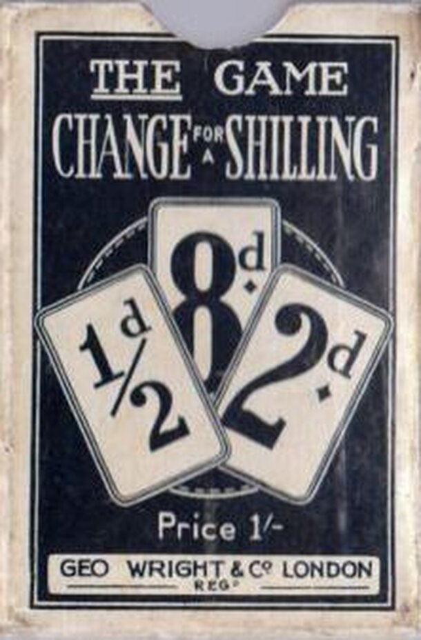 48 cards with different values on them, from a halfpenny to eight old pence. Probably aimed at parents who wanted to buy an educational game for their children. Cards are revealed around the table and if the exposed cards total a shilling (12 old pence) or more then the first to shout that observation, wins. Very good to get children used to money and also...