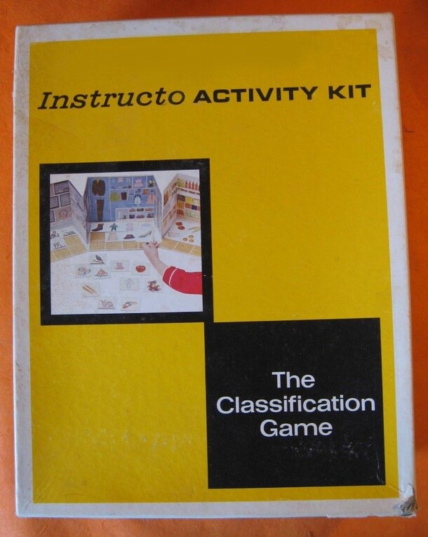 This is a boxed set of four brightly colored cardboard scenes that fit together to stand up in a three dimensional display: a toy collection, clothes closet, zoo, and grocery. Each scene has twelve printed tiles of images that belong in that scene. The object is to classify the image cards into the correct scenario. Does the bunny go in the grocery store...