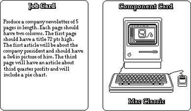 The players will be able to list the type of computer, software, printer and memory requirements needed to complete a specific office task. Players must try to match their COMPONENT cards with the task on the JOB card. When a player has a correct combination, they lay down their cards and earn 100 points. The winner is the first player to earn 500 points....