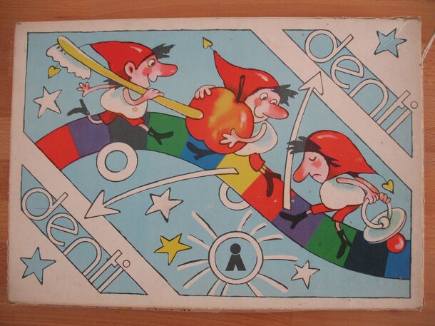 From the package: Dental care - healthy eating - an educational game They players roll alternately a die and move their pawns (styled like a tooth) along the track on the board. The first player moving its pawn on the last field wins. There are some arrows on special fields of the board that move the pawns forward or backwards. That depends on the picture...