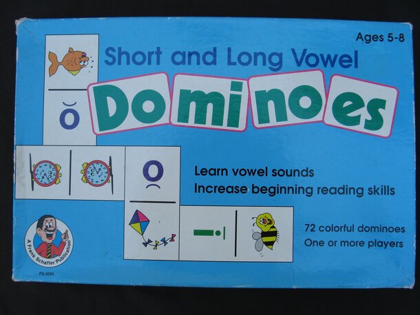 Short and Long Vowel Dominoes is an educational twist on traditional dominoes designed to teach short and long vowel sounds. In this game, dominoes have combinations of short vowels, long vowels and pictures. Each player draws six dominoes. Dominoes are played in a single line. Dominoes may be laid down by matching vowel to vowel, a vowel to a picture with...