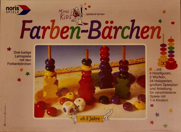 Three funny games to learn the colours with colourful bears and perls. collecting perls: each player is trying to be first player who has collected one perl of each (5x) colour by rolling the colour dice. coloured bears: each player is trying to be first player who has collected the coloured perls in the defined order on the board by rolling the colour...