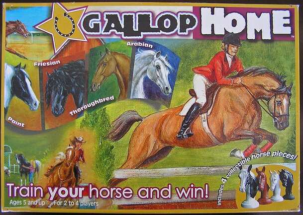 From the box: "Train your horse and win! Have you ever wanted to train your own horse? Now you can with the game Gallop Home! Travel around the board in this exciting, fun filled, educational game that will take your imagination into the horse world." Each player chooses one of four horses, each having a corresponding game pad and a plastic, molded...