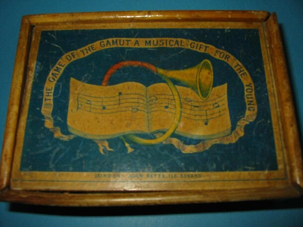 THE GAME OF THE GAMUT a Musical Gift for the Young - By John Betts, 115 Strand, London (his address 1845 - 1874) - The game consists of a wooden box with sliding lid containing thirty-six playing cards each showing a music book with chord on it and trumpet with number to top. One player calls out a number and the person holding the card - replies with the...