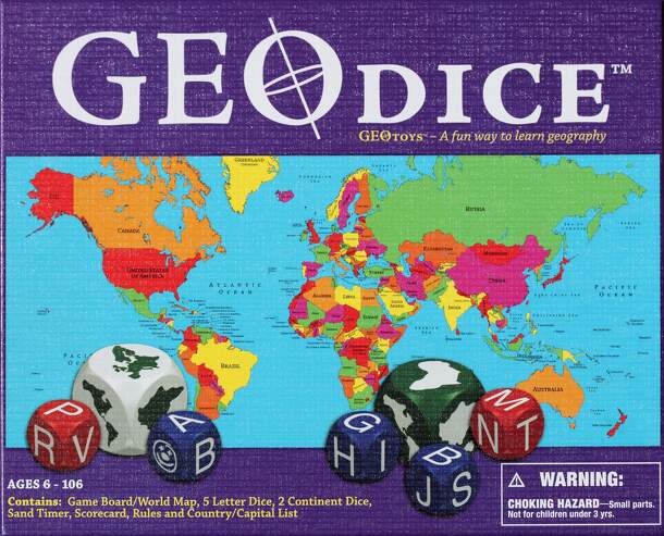 The goal is to name countries and capitals that start with the letters on the five Letter Dice, and that are within the continents on the two Continent Dice. With colorful dice and a two-sided Game Board that doubles as a world map, GeoDice is a beguiling introduction to world geography! A fun way to learn geography! Roll into world knowledge with GeoDice...