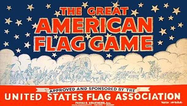 This educational game was released in 1940, and re-released in 1943 with slightly altered rules. The game board depicts a map of the United States with all the State Capitals listed, and a track of Stars (spaces), each listing a State's name and the year it was admitted to the Union. An American flag is placed on every eighth Star (there were only 48...