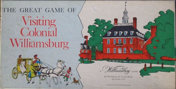 This game appears to be similar to Parcheesi in certain ways. The goal of the game is to get all four of your pieces around the track on the board from your starting area to your goal area. Each turn, a player draws a card from the deck. There are four each of twelve different cards in the deck. Each card names and describes a location in Williamsburg....