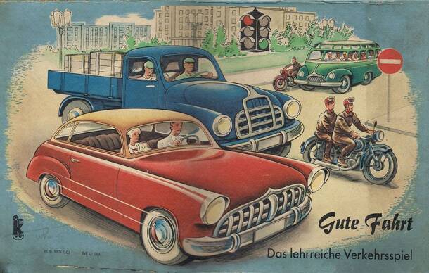 The game about Good Driving, made in East Germany in 1960. The box image shows various vehicles but the car was fiction. The Trabant owning citizen could only aspire for such a car, a wish he knew would never be fulfilled. The board shows a road network with dials at both ends. Each player starts in a different corner and the objective is to get back to...