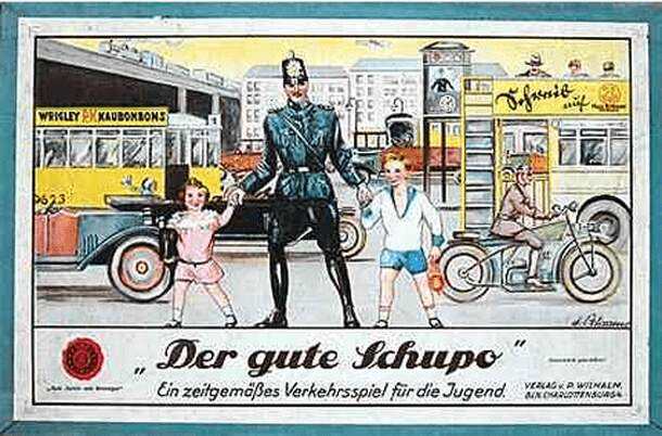 Objective: be the first reaching target space (space 60 before WWII/space 50 after WWII) & learn traffic rules - moving by turns - simple 'Roll & Move' game; ending on a marked space follow instructions printed on lid inside. remarks: pewter figures - changing designs over the decades due to product lifecycle - from very first edition 1926 to last edition...