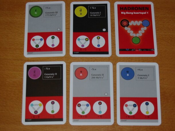 Game consists of 54 cards depicting quarks and antiquarks of the various colors. Players are manifestations of the Strong force soon after the onset of the Big Bang with the goal of collecting sets of quarks to form baryons and mesons to score points. Sorry, no leptons in the game! This is an educational game provided by a Dutch high-energy physicist to...