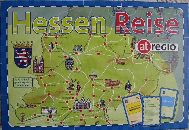 The players travel through the federal state of Hesse, Germany. They receive one town card which becomes their "home card". They get 11 more cards which they have to organize for their travel from town to town. The destination is the capital Wiesbaden. The die lets the pawns move. A "free time" card is taken when a 6 is rolled. It contains events that...