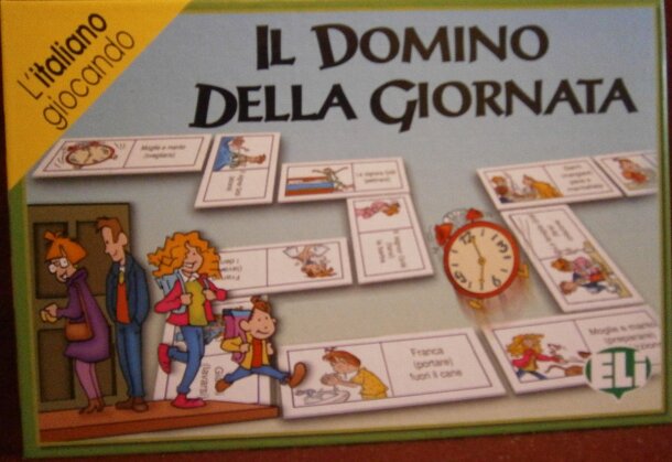 A language learning game, designed to study the conjugation of Italian verbs (both regular and irregular). With the 48 tiles the game tells the story of a day in the life of the Grilli family. Each tile has a picture on the left side and a text on the right side. In the text the verbs are all in the infinitive form, and have to be conjugated when the tile...