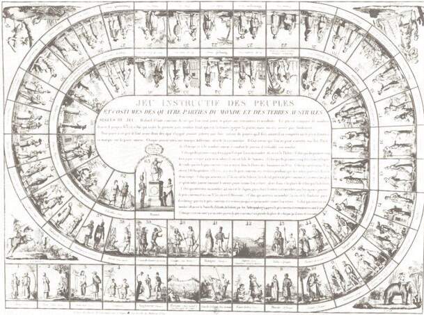 [An educational game about peoples and clothes in the four parts of the world and Australia] A roll-and-move game with 63 squares, where the journey begins in China and ends in the heart of Paris. Compositions allegorical of Europe, Africa and America fill the four outer corners, while the rules occupy the centre. The warmth of the Tahitian welcome is...