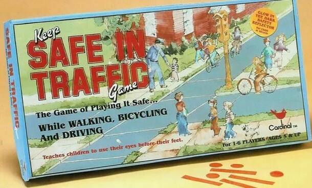 "The game of playing it safe... while walking, bicycling, and driving." Teaches children to use their eyes before their feet as they move tokens around a street grid. The crossing guard tokens helps the children and the game also teaches kids to avoid talking to strangers. Situations include crossing at a traffic light, dialing 911, and hitchhiking....