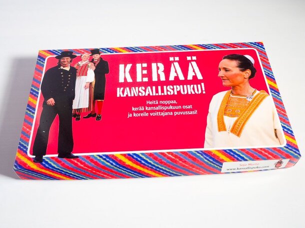 A simple roll-and-move game about Finnish folk costumes. The goal of the game is to collect a set of five cards from the same folk costume. One card may be replaced with a wild "trader" card. On their turn, players roll a D6 and move along a board. Depending on the square landed, player may either take a card from the deck, trade cards with another player...