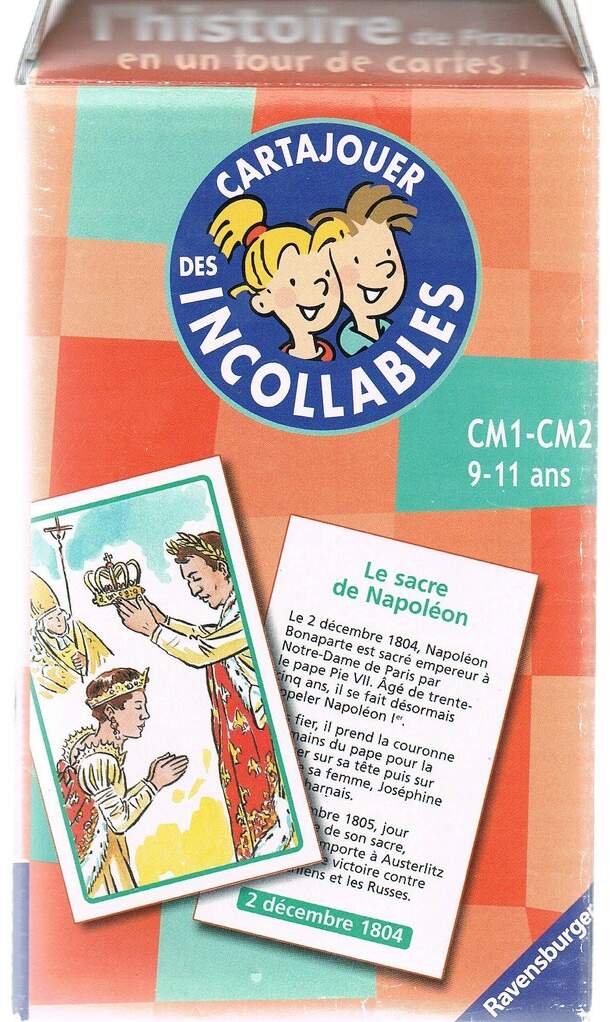 Card game for children aged around 10 years old. There are rules to four games using the cards. Game 1: Qui, quoi, quand? A game for 2 players The cards are shuffled and placed in a stack in the centre of the table. On a turn, the player takes the top card and looks at the picture and the text on the other side of the card. From this, he or she must guess...
