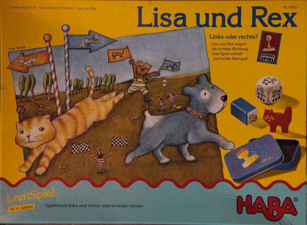 This is a simple game designed to teach children the difference between right and left. The game is played by rolling a die and moving one of two pieces on a board, trying to collect stamps from a stamp pad on a sheet. There are two shared pieces: Lisa the cat, who always travels to the left (clockwise); and Rex the dog, who always travels to the right...