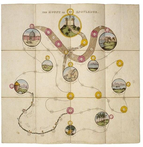 The game features a path through a landscape, with small circular pictures showing a wood, a river and other features. The first circle, called the Horn Book, reflects one of the teaching methods of the time. Players must stop here to learn the letters of the alphabet. There are various forfeits and rewards along the way. These include punishments for...