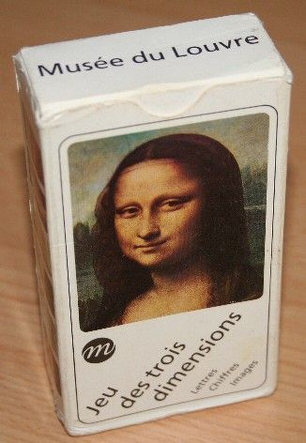 Subtitle: Jeu des trois dimensions - Lettres, Chiffres, Images Contents: 72 cards of which three jokers and 69 cards containing a letter, a number and a picture of art belonging to the Louvre museum. (e.g. there is a card depicting Mona Lisa, containing letter R and number 11) The target of the game is to make up the name "musée du louvre", taking into...