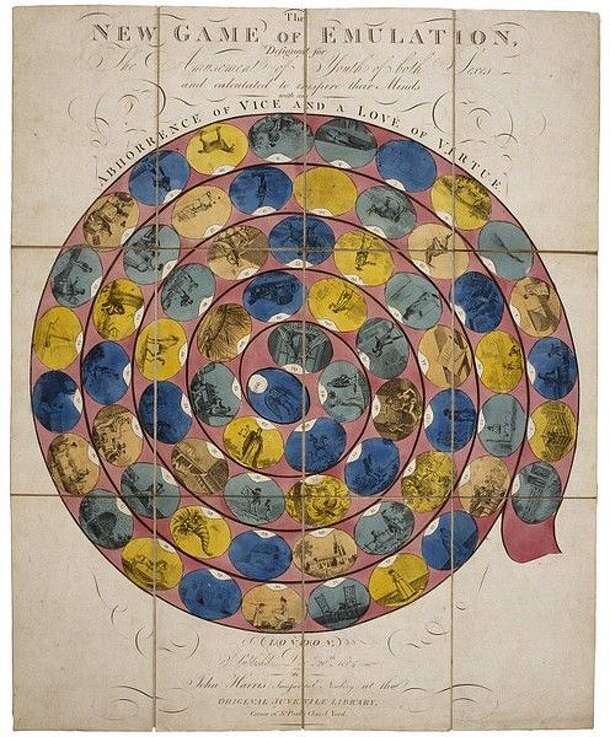 A race game of Moral Improvement. From No 1 Turnpike Gate to No 66, "Virtue is its Own Reward"! It was marketed as a morality game designed to lead children to admire and adopt the virtues of Obedience, Truth, Honesty, Gentleness, Industry, Frugality, Forgiveness, Carefulness, Mercy, and Humility; and to view in their real colours the opposite vices of...