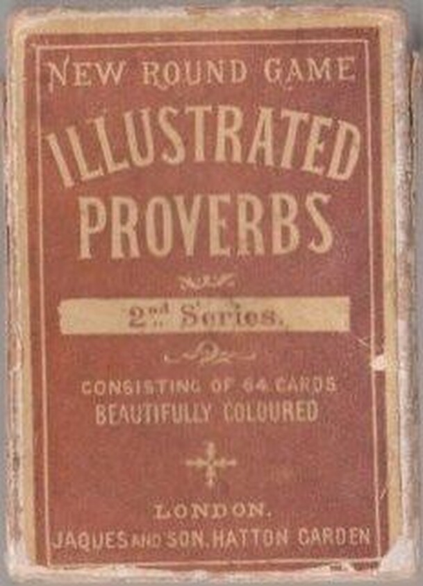 This game of 63 cards uses proverbs with humorous illustrations as its teaching tool. The idea of the game being to collect the words that make up the proverb. The Twelve Proverbs are shuffled and dealt out to the players. The player on the left hand of the dealer commences the play by asking any other player for a card of any Proverb of which he holds one...