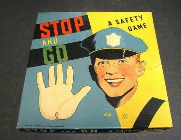This card game has a deck of 56 cards: 10 each of Vehicles Inward and Outward and of Pedestrians Left and Right; 15 traffic light cards (five each Stop, Caution, Go); and a single Policeman card. The rules refer to a board, but a diagram on page 4 shows that it is very basic, essentially a square enclosing two diagonals. One diagonal is for the vehicles...