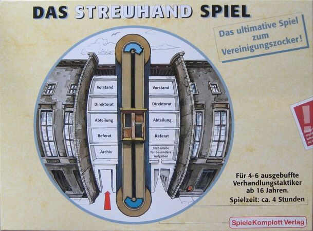 Das Streuhandspiel is a board game that is set against the early years of the German reunification (1990s). Players assume the roles of rich influential men who try to make profits by exploiting and buying out the East German industry. The game is played over the course of 16 rounds, in which each player takes a turn of action. After every 4 rounds, the...
