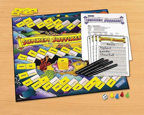 Publishers description: "Players search for pirate's treasure by matching suffixes to root words—building essential vocabulary skills as they play! To play, students try to match suffixes on their game cards to root words on the board…then build each new word on their write & wipe cards. The player to build the most words wins the game!" Game components:...