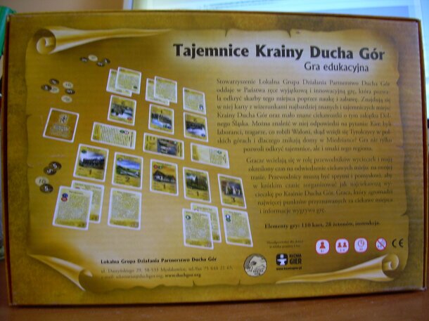 Tajemnice Krainy Ducha Gór is an educational game about places of touristic interest around Jelenia Góra. Players are tourist guides competing to take their groups to most interesting places, while their actions are limited by cards in hand and time tokens they are given. The game deck consists of two types of cards: sightseeing places and interesting...