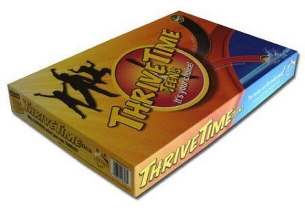 Thrive is an educational board game about health. The aim of the game is to reach your own goals by good choices. The winner is the first person to have sufficient cash to pay for their fourth goal. Each player takes a goal pad and writes four goals, ranging from short to long term, in the spaces. Short term goals are worth $50,000 long term goals are...
