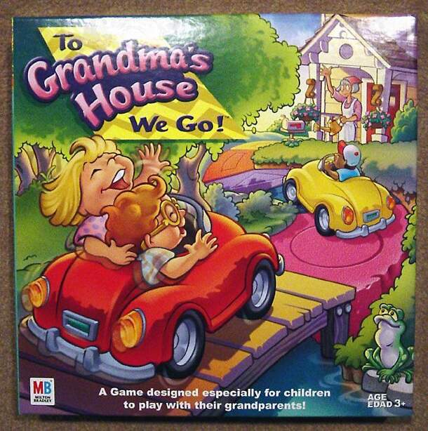From the box: "A Game designed especially for children to play with their grandparents!" From the instruction sheet: "Make your way over the river and through the woods. If you are the first player to reach Grandma's House, you win!" In this game for children age 3 and up, players take turns drawing cards then following the instructions on the cards to...