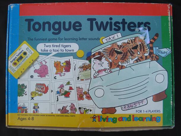 From the box: "Tired tigers, ruffled rabbits, wiggly worms and others get together to make a very funny learning game. Your children will play again and again by themselves by themselves or with friends, at home or in the car. They listen to the Tongue Twisters on the cassette and match them to their lotto board. To play, each person takes a lotto board...