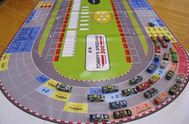This game has been designed with Nascar and Indy fans in mind. It is a huge 4-lane oval racing track (98" x 50") that has been designed to fit 1:64 scale cars like NASCAR diecast, Hotwheels, Matchbox, etc. (cars are NOT included). It doubles as a great board game when played with dice (2 included in the shipping box). The rules of the game make it feel...