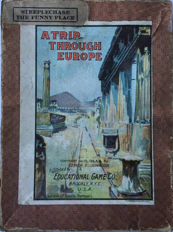 This educational board game was one of a trio of games published around 1900 by The Educational Game Company, headed by Elmer E. Johnson, also president of The Regents Institute, a school for boys and girls in Brooklyn, NYC. The square paper game board features five maps, one in the middle showing Europe as a whole, and the rest showing parts of the...