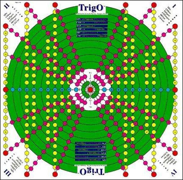 TrigO™ is a creative board game that teaches the rudimentary concepts of trigonometry. The game has six levels of play ranging from beginner to advanced. Each player receives 6 playing pieces of the same color, one for each of the trigonometric functions. There can be 2 to 6 players. Players will learn the names of the six major trigonometric functions:...
